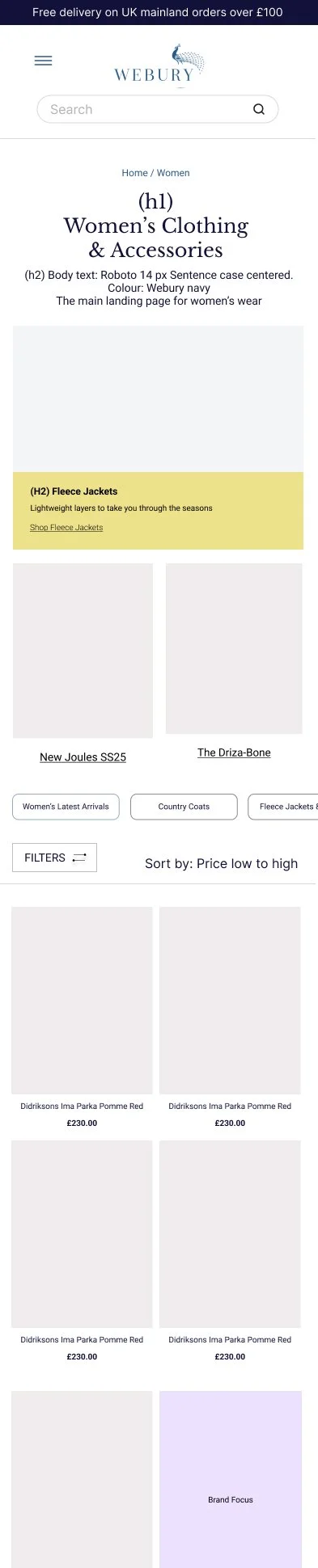 Analysed and optimised top tier catalogue landing pages by adding prominent product displays with clear categories and more efficient filter position to stremaling customer experience. Validated concepts via wireframing and rapid prototype testing. Then succession of mid-fidelity design to flesh out content and sign-off, then high-fidelity designs for hand-off with dev team.